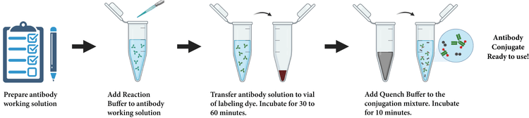 Quick and simple two-step labeling protocol, no chemistry or conjugation experience necessary