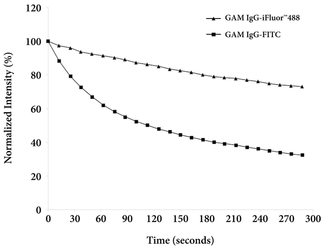 Despite its bright green fluorescence, fluorescein based-dyes and conjugates have a number of caveats that may restrict its use in certain applications, including rapid photobleaching, pH-sensitive fluorescence and susceptibility to quenching. The iFluor® 488 dye-with identical spectral properties - produces brighter, more photostable conjugates with pH-insensitive fluorescence over a wide molar range. iFluor® 488 dye molecules can be conjugated to biomolecules at high molar ratios with minimal self-quenching (Figure 2 and Figure 3).