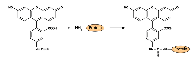 fluorescein. The isothiocyanate moiety (-N=C=S) on FITC reacts with amino-terminal and primary amine groups on the target biomolecule to form a covalent thiourea bond. The resulting fluorescein conjugates can be used as specific probes in several applications, including enzymatic kinetics, immunocytochemistry, immunohistochemistry, fluorescence microscopy, flow cytometry, and fluorescence