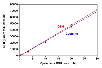 GSH and cysteine dose responses were measured in a 96-well black solid plate with Amplite® Fluorimetric Thiol Quantitation Assay Kit using a NOVOstar microplate reader (BMG Labtech). As low as 10 nM (1 pmol/well) of GSH or Cysteine was detected with 10 minutes incubation (n=3).