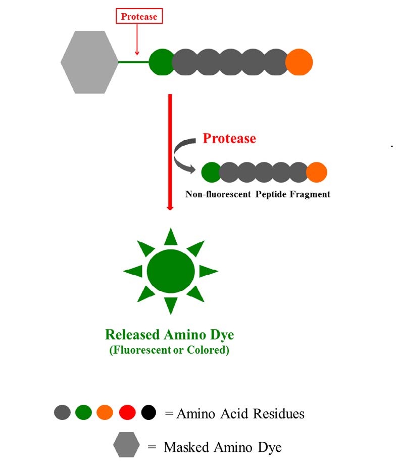The caspase-sensitive peptide fragment-masked amino dyes are digested by a caspase to generate the highly fluorescent dye (or a highly colored dye). The fluorescence (or color) intensity increase is proportional to the caspase activity.
