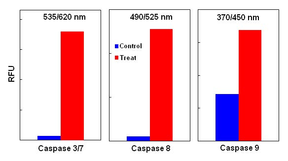 Detection of caspase activities in Jurkat cells. Jurkat cells were seeded on the same day at 200,000 cells/well in a Costar black wall/clear bottom 96-well plate. The cells were treated with staurosporine at the final concentration of 1 µM for 4 hours (Red Bar) while the untreated cells were used as control (Blue Bar). The fluorescence intensity was measured with FlexStation fluorescence microplate reader at the indicated wavelength. The caspase 3/7, 8 and 9 activities can be detected in a single assay without interferences from other caspases.