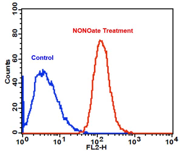 Cell Meter™ Fluorimetric Intracellular Nitric Oxide Assay Kit 16356 uses Nitrixyte™ Red that reacts with NO to generate a bright red fluorescent product. The NO-generated fluorescent product of Nitrixyte™ Red has spectral properties similar to those of Texas Red®. Nitrixyte™ Red can be readily loaded into live cells, and its fluorescence signal can be conveniently monitored using the filter set of Texas Red®. This kit is optimized for flow cytometry applications.