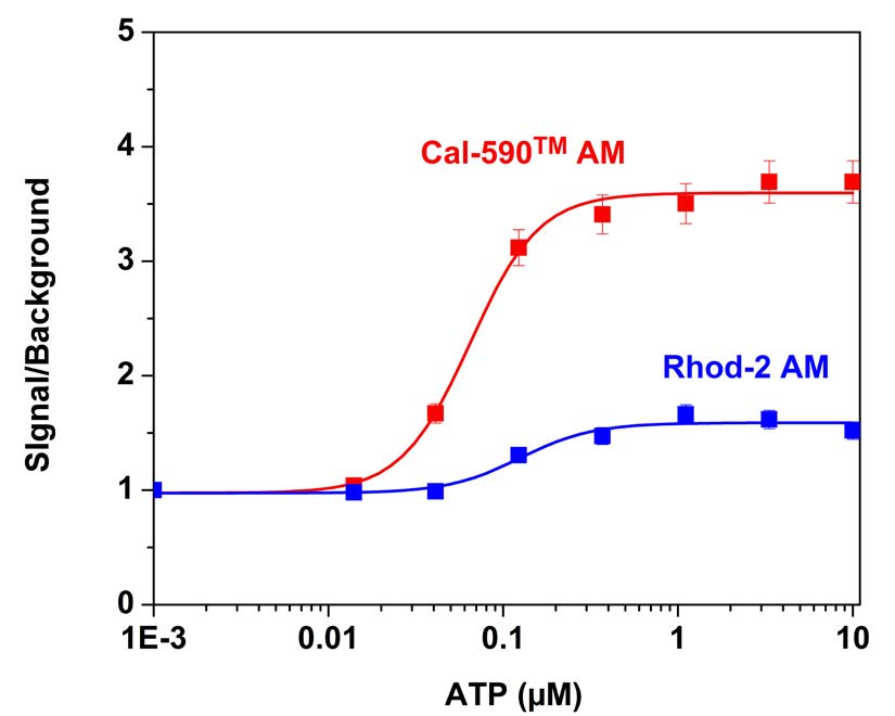ATP-stimulated calcium response of endogenous P2Y receptor in CHO-K1 cells incubated with Cal-590™ AM (red curve, Cat# 20510) and Rhod-2, AM (blue curve) under the same conditions. CHO-K1 cells were seeded overnight at the cell density of 50,000 cells per 100 µL per well in a 96-well black wall/clear bottom plate. 100 µL of 5 µg/mL Cal-590™ AM or Rhod-2 AM with 2.5 mM probenecid was added into the cells, and the cells were incubated at 37 °C for 1 hour. ATP (50 µL/well) was added by FlexStation® (Molecular Devices) to achieve the final indicated concentrations.