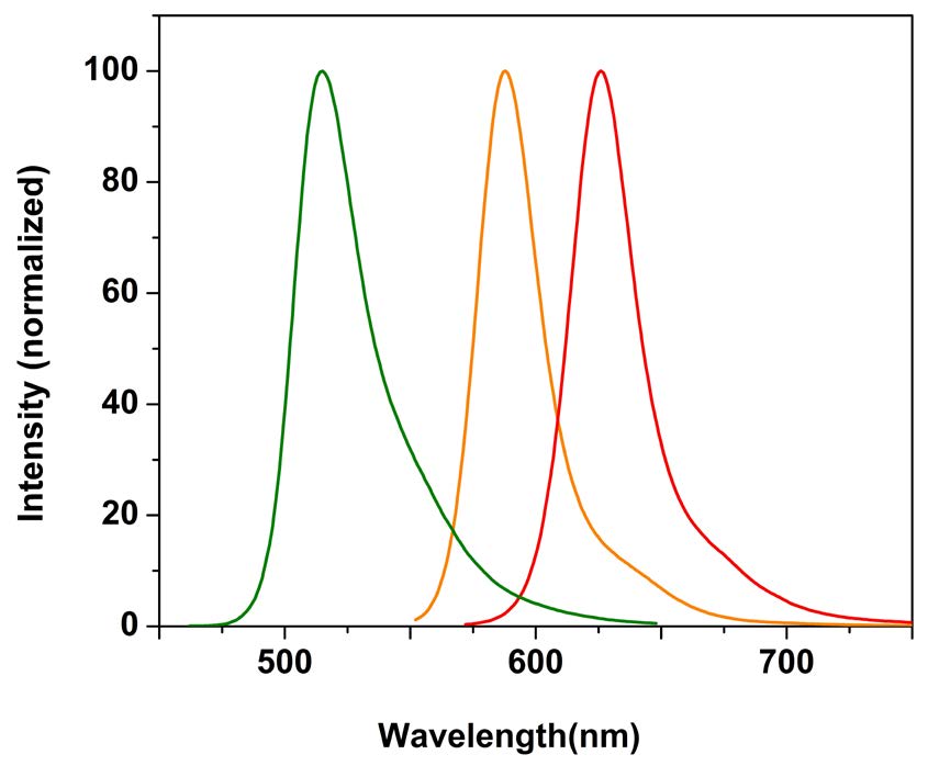 Normalized emission spectra of Cal-520™ (Green), Cal-590™ (Orange) and Cal-630™ (Red).
