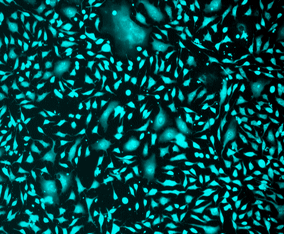 Image of CPA cells in a 96-well Costar black wall/clear bottom plate stained with CytoCalcein™ Violet 500 (Cat# 22013, Ex/Em = 405/500 nm, 405 Violet filter).