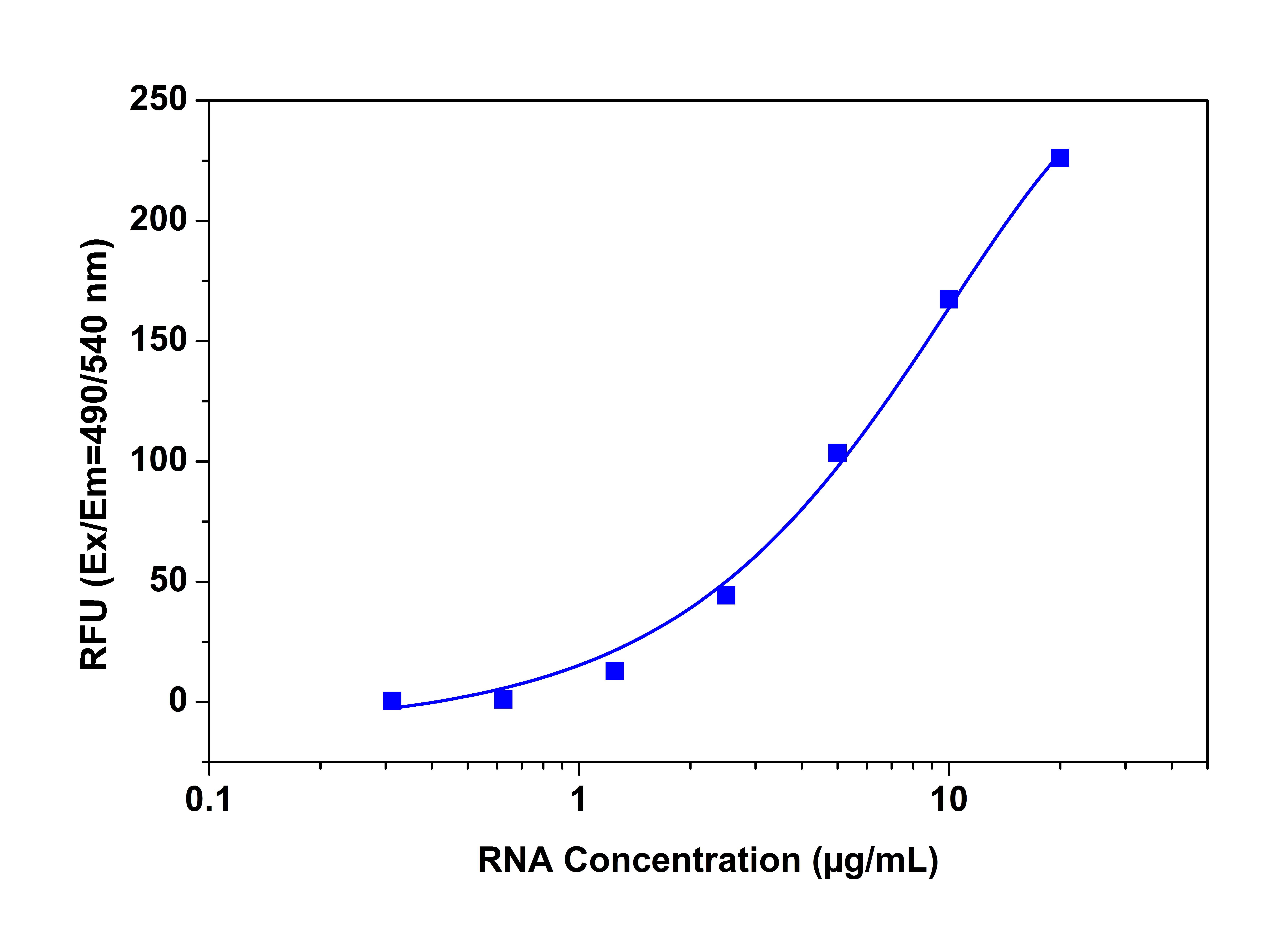 RNA dose response measured with StrandBrite™ Green Fluorimetric RNA Quantitation Kit (Cat#17657) in a solid black 96-well microplate using a Gemini microplate reader (Molecular Devices).