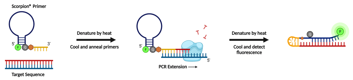 An illustration of the mechanism of action of Scorpion® primers. Scorpion® primers combine a target-specific primer and probe in a single sequence for rapid qPCR quantification (figure made in BioRender).